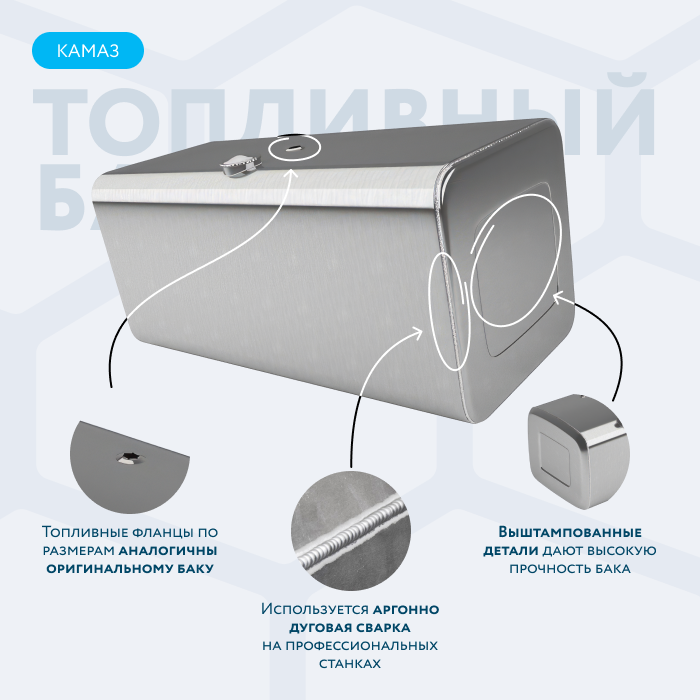 Алюминиевый бак не подвержен коррозии, что делает его более долговечным, а так же сбережет вашу топливную систему. Бак из алюминия в два раза легче стального бака, хотя он и изготовлен из листа увеличенной толщины в 2,5 мм. В конструкции предусмотрены цельные перегородки, которые проварены по периметру. Баки из алюминия так же оснащены заливной горловиной с самозапираемым непроливаемым клапаном (который становится барьером для разлива топлива, а так же становится защитой от попадания мусора в бак при открытой крышке) . Кроме того, однозначно что алюминиевый бак выглядит намного привлекательнее и дороже - где бак в том числе становиться и элементом тюнинга автомобиля. На алюминиеввые баки действует увеличенная гарантия - 36 месяцев.